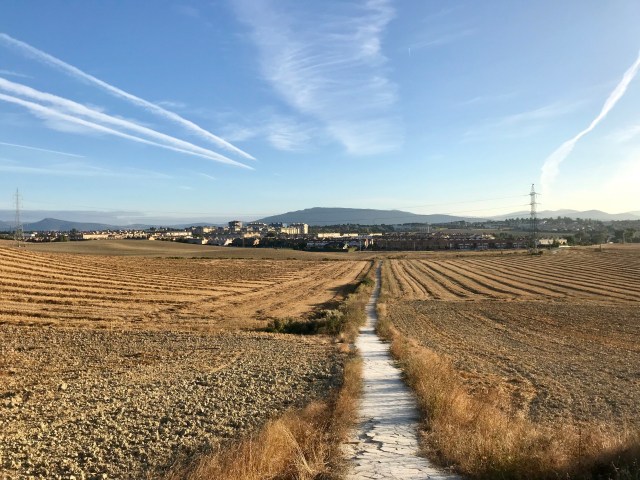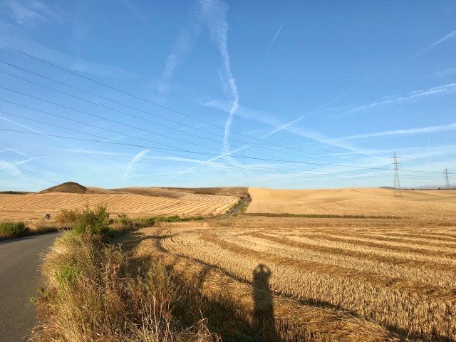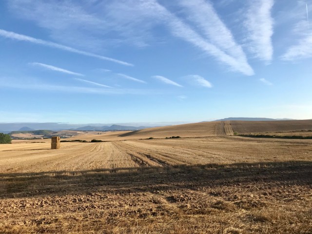 The route out of Pamplona ascends slowly up onto a mountain ridge peppered with wind turbines, with miles of golden straw-filled meadows around.
