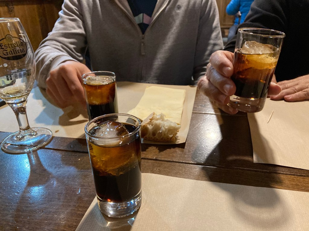 Runny Omelettes consumed, as recommended by Jonay: 1, actually a tortilla, ordered by Raul and Alberto as they educated me on Galician food and 34% café liqueur at Casa Miranda this evening.