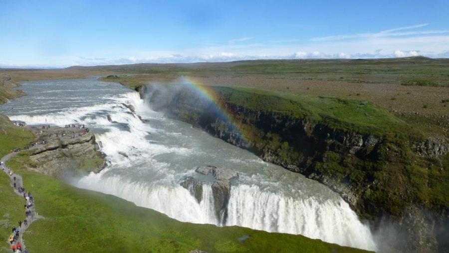 A double drop waterfall with a cascade of more than 30 metres and lots of spray as millions of gallons of water crash into a narrow ravine, Gullfoss is a marvel at any time of the year.