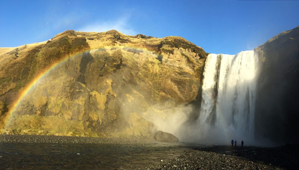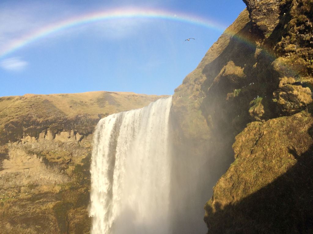 The sprinkling spray produces rainbows the instant the sun lights up the South Iceland sky – single and double arcs, or even full circles on the most golden of days come and go with the strength of the sun’s beams.